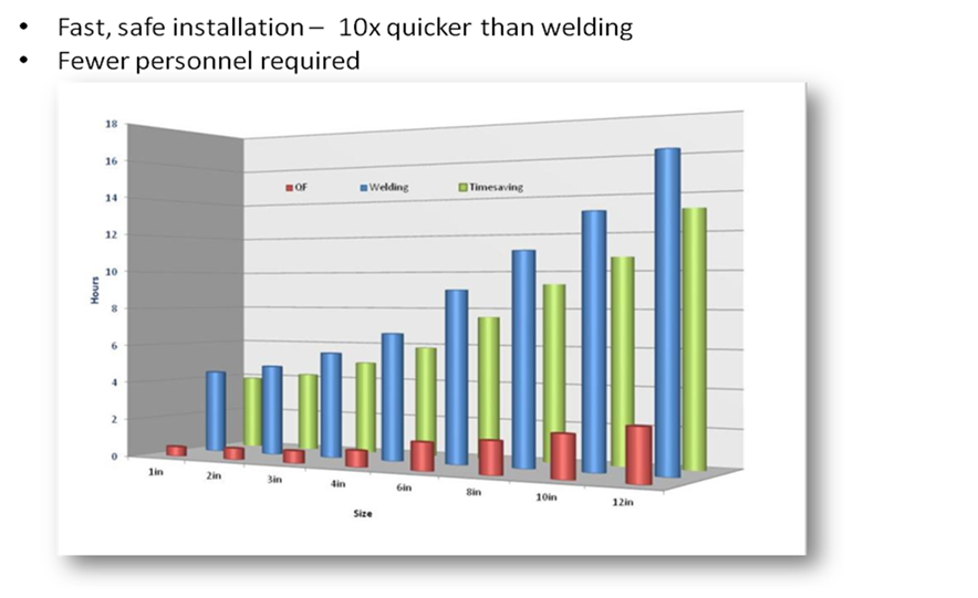 *Devido á rapidez na instalação, reduz o tempo em paradas. Exemplo: foram instalados 17 quickflanges em uma linha de inox em um único dia; e 2 quickflanges de 6 polegadas classe 600# em um único dia também. Obs.: o de 6`` foi instalado e entregue testado ao cliente no mesmo dia